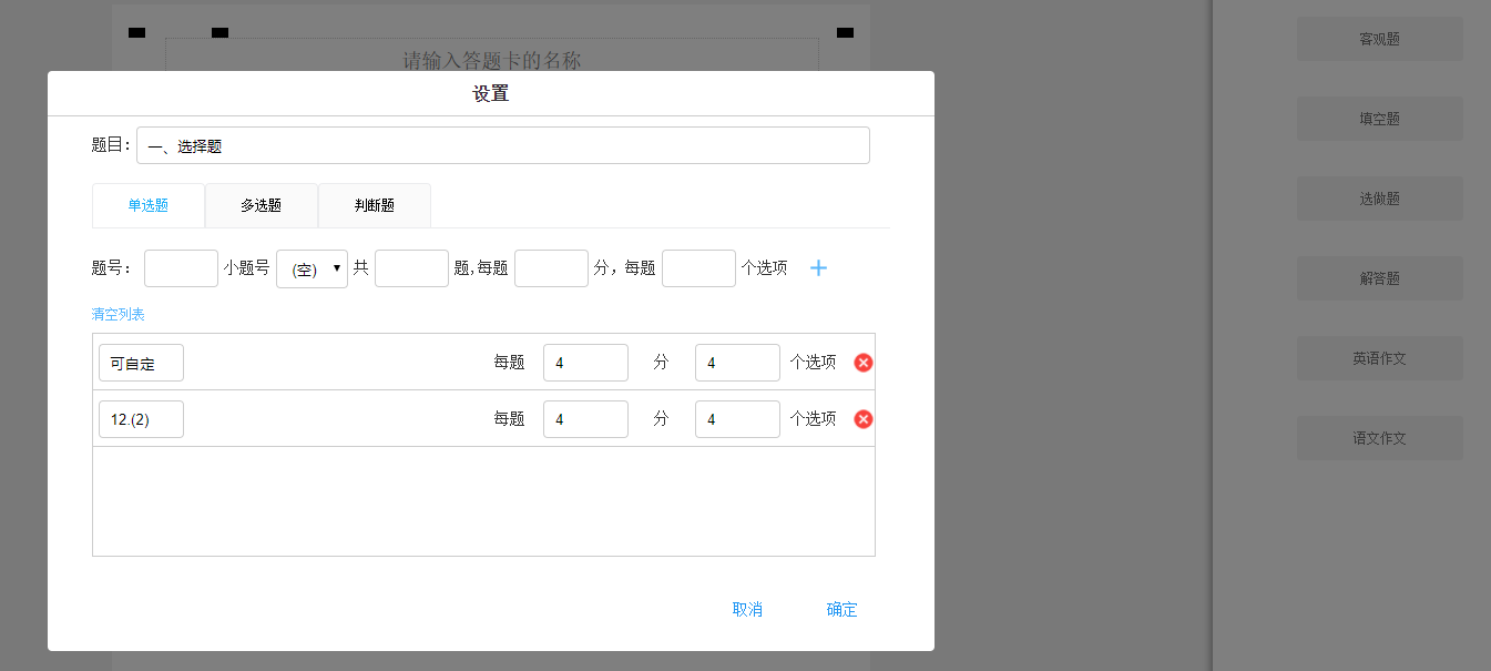 (2)使用模板添加的题型,不能变更其题型的数量、结构,否则模板码将改变,不再适用于已印制试卷。