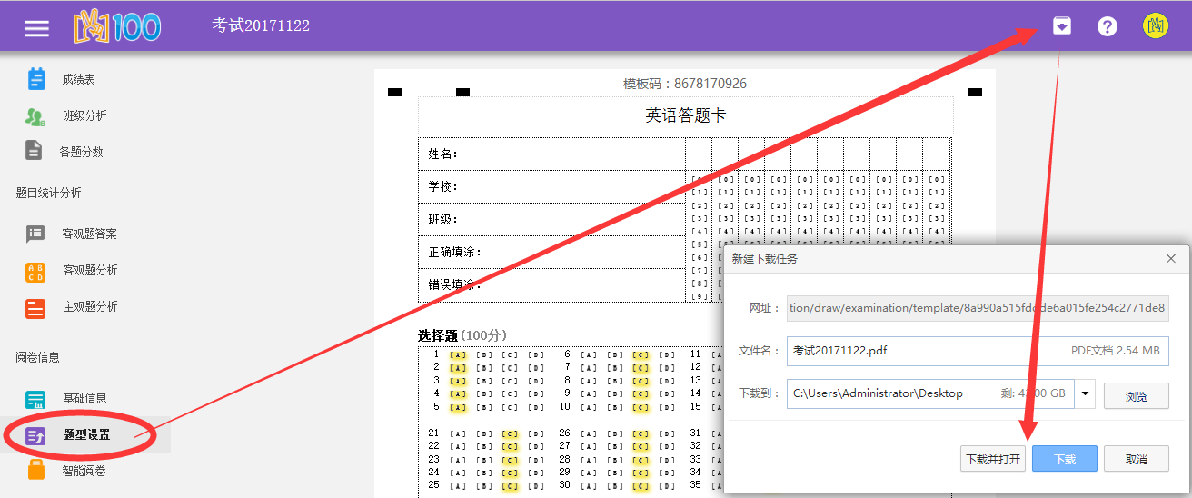 2)若已打印答题不要轻易修改题型设置,否则模板码改变不能阅卷