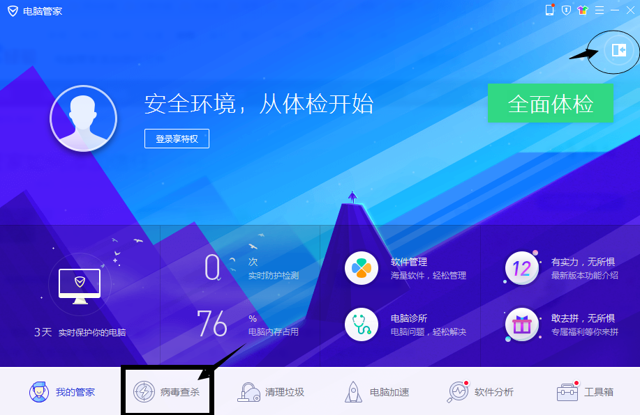 1、打开腾讯电脑管家,点击右上角的按钮切换到软件的经典界面。