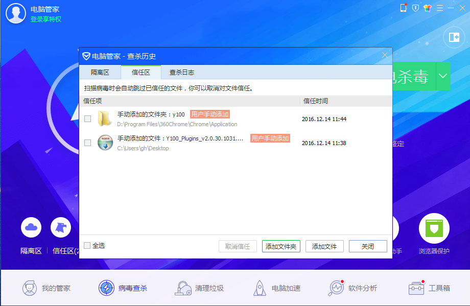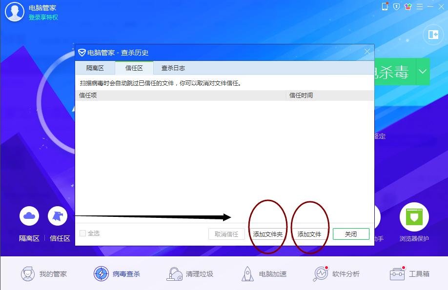 4、进去之后点击添加文件或者添加文件夹将自己信任的文件添加进去,这样杀毒软件在杀毒的时候就会忽略掉这些文件。