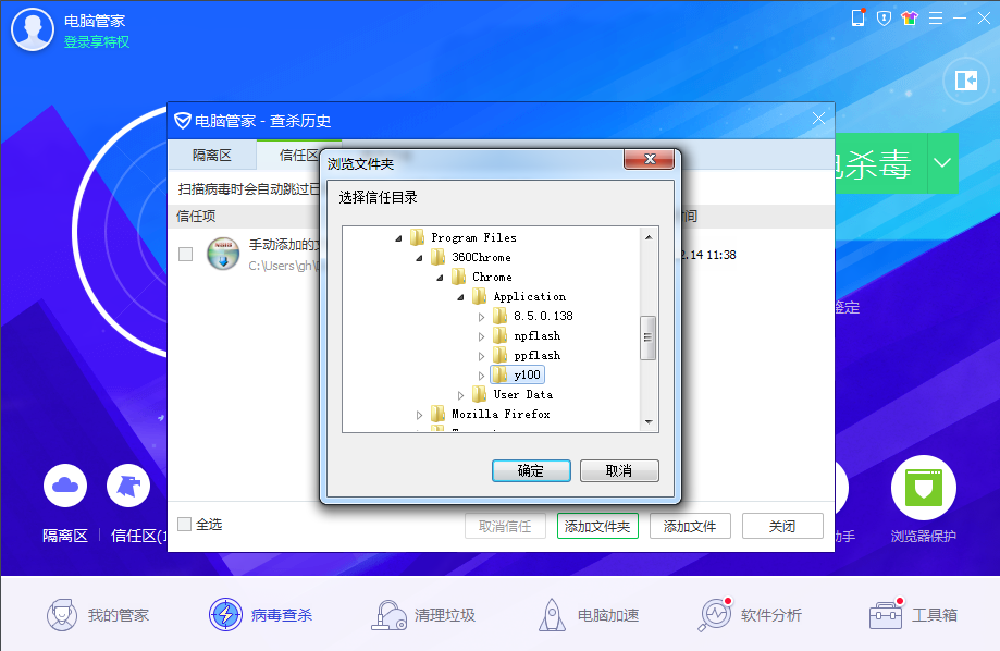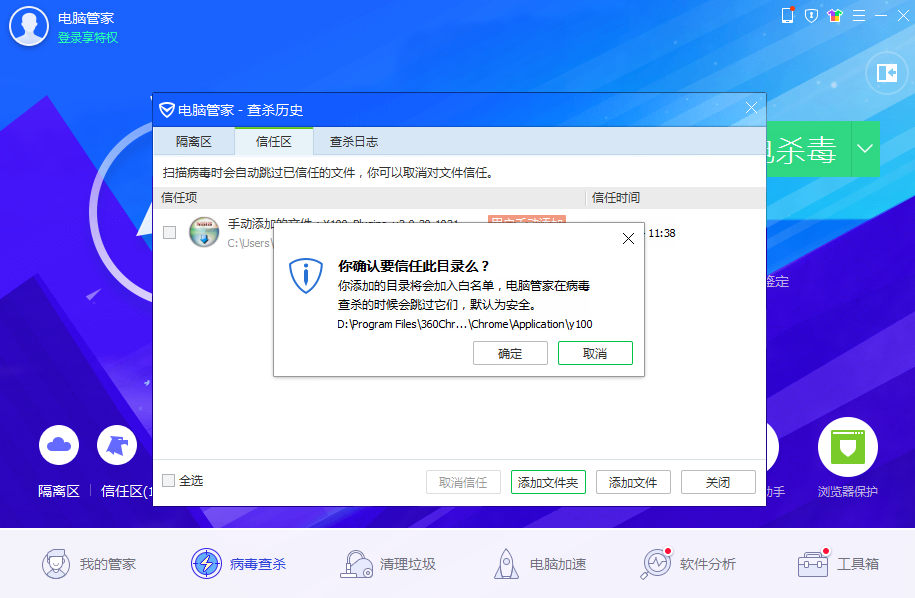 请点击信任区界面右下角的【添加目录】;寻找到Y100阅卷助手安装目录文件夹Chrome选中添加;