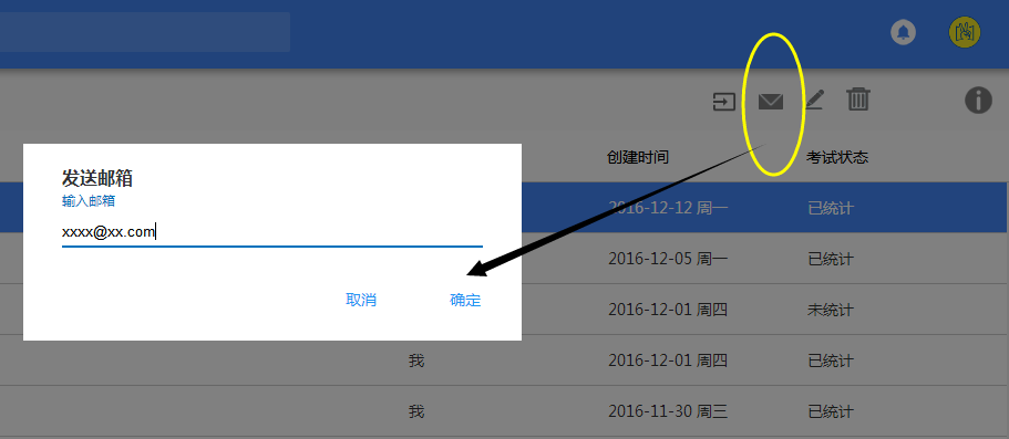 选中某次考试,在考试列表的右上角点击邮箱标示的按钮,输入电子邮箱就可以收到该次考试的成绩报表。