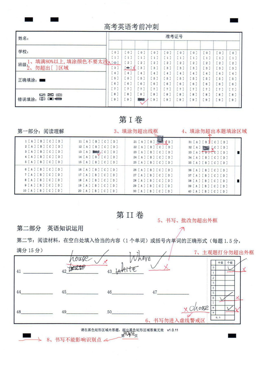 (1)填满[ ]的80%以上,填涂颜色不要太浅,上下左右不能超过[ ]的10%;